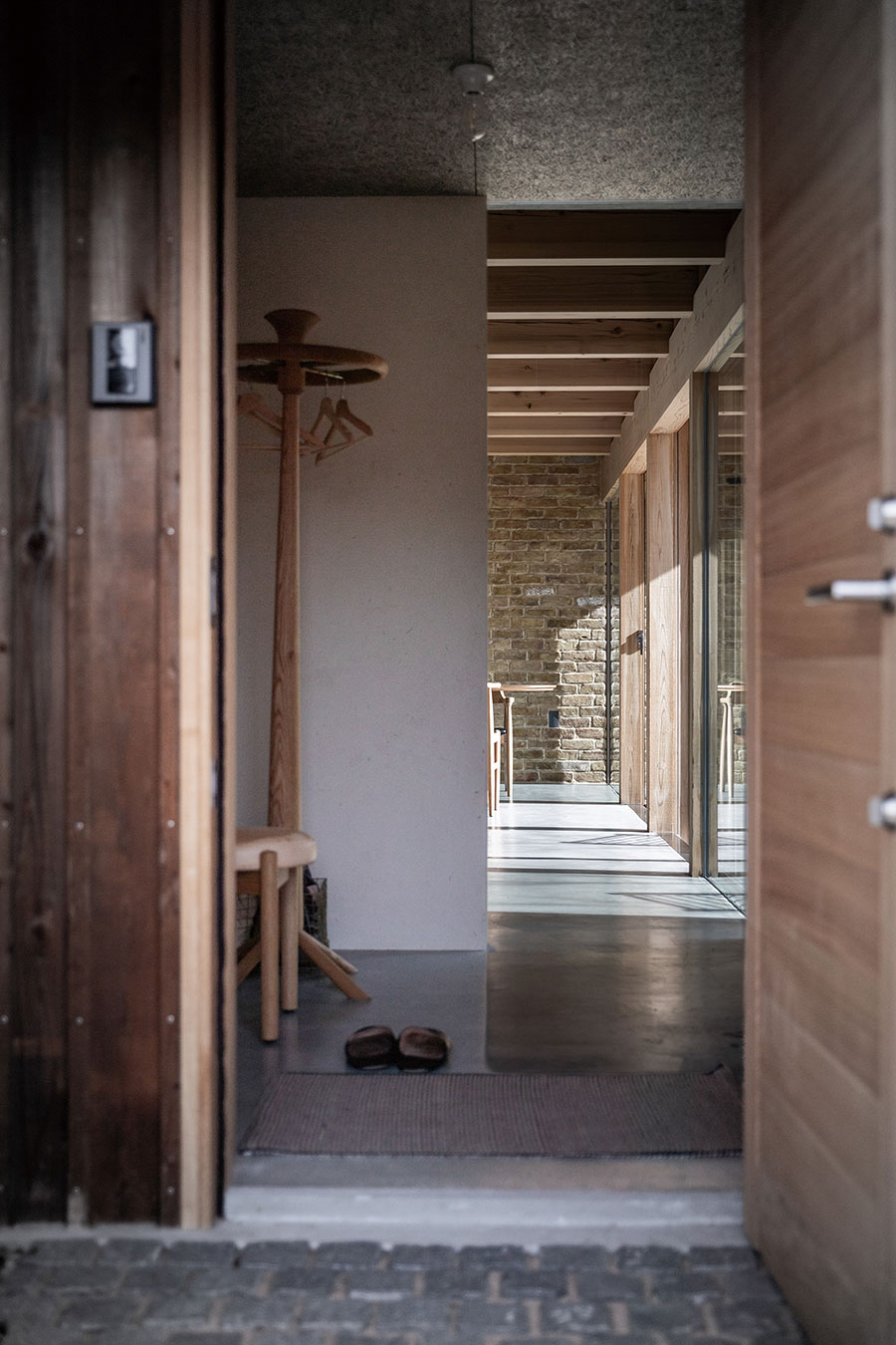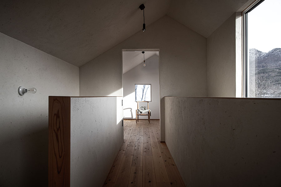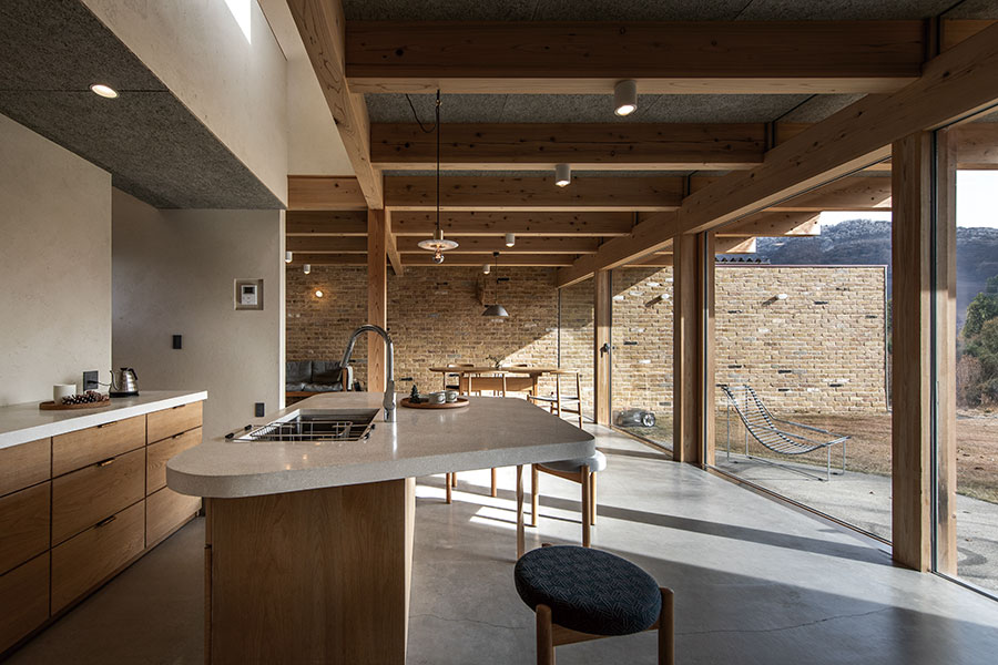 2つの全く異なる素材で彩られた家、GRENZEN(境界線)。特徴的ながらも、自然豊かな風景に溶け込むように、プロポーション、素材感、色味の全てが洗練されている。土間仕上げのLDKスペースからは、ブリックタイルの壁、磨き材の梁、そして床面までもが開口面を突き抜けて庭先へと連続している。それが家の内外の差を曖昧にし、坪数以上の空間的拡がりを生み出している。ミニマルな構成の階上は、どちらの窓からも緑をたたえる草屋根が視界一杯に広がり、まるで借景の様に、遠くに広がる自然の景色を、家の中まで引きこんでくれる。心理的境界線を、建築的意匠によって巧みに操作している、菱田工務店のフラグシップ。※規格住宅ではありません
